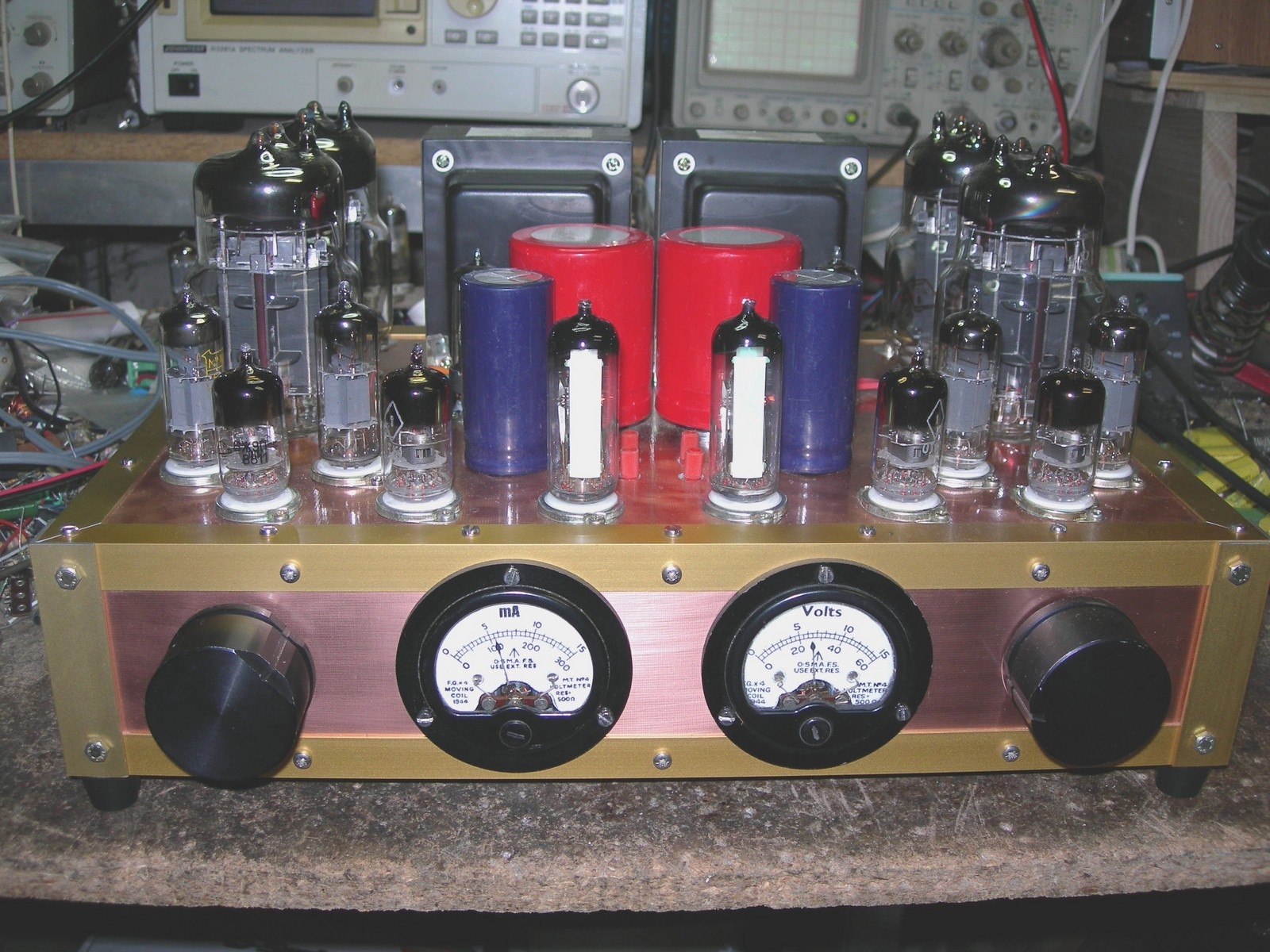 Un oeil magique 6E3P (copie Russe de l'EM84) a été utilisé sur chaque voie de l'amplificateur, et fait fonction de vu-mètre.