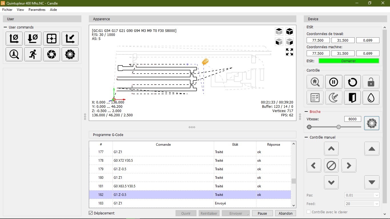 Après l'exécution de chaque ligne de code, le déplacement correspondant sur le dessin devient bleu clair, et le symbole d'une fraise conique se déplace selon les coordonnées de la ligne de code suivante, ceci jusqu'à la toute dernière ligne du programme.