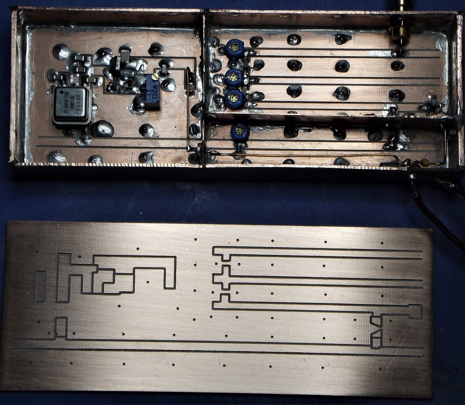 La technique du PCB fraisé s'accomode très bien avec la réalisation de lignes imprimées pour des constructions UHF, comme sur la photo qui suit.