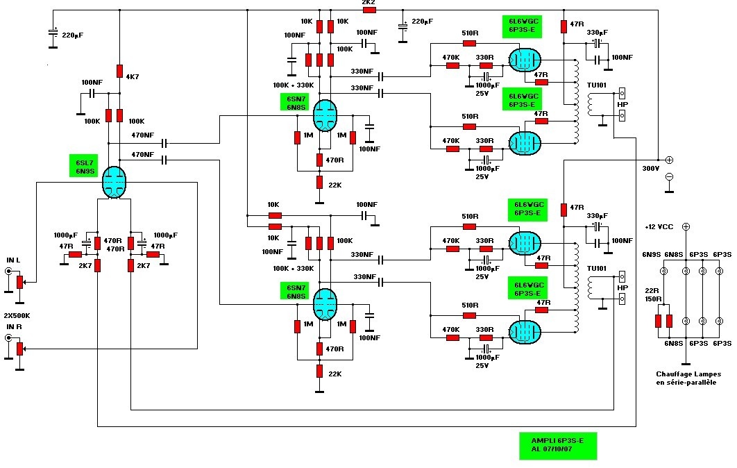 L'impédance du primaire des TU101 étant de 8000 ohms d'anode à anode, le courant de repos des 6P3S-E a été réglé à environ 42 mA, bien en dessous de leur régime normal, pour respecter la charge des transfos, prévus à l'origine pour des EL84, dont le courant d'anode moyen est inférieur aux 6P3S ou 6P3S-E